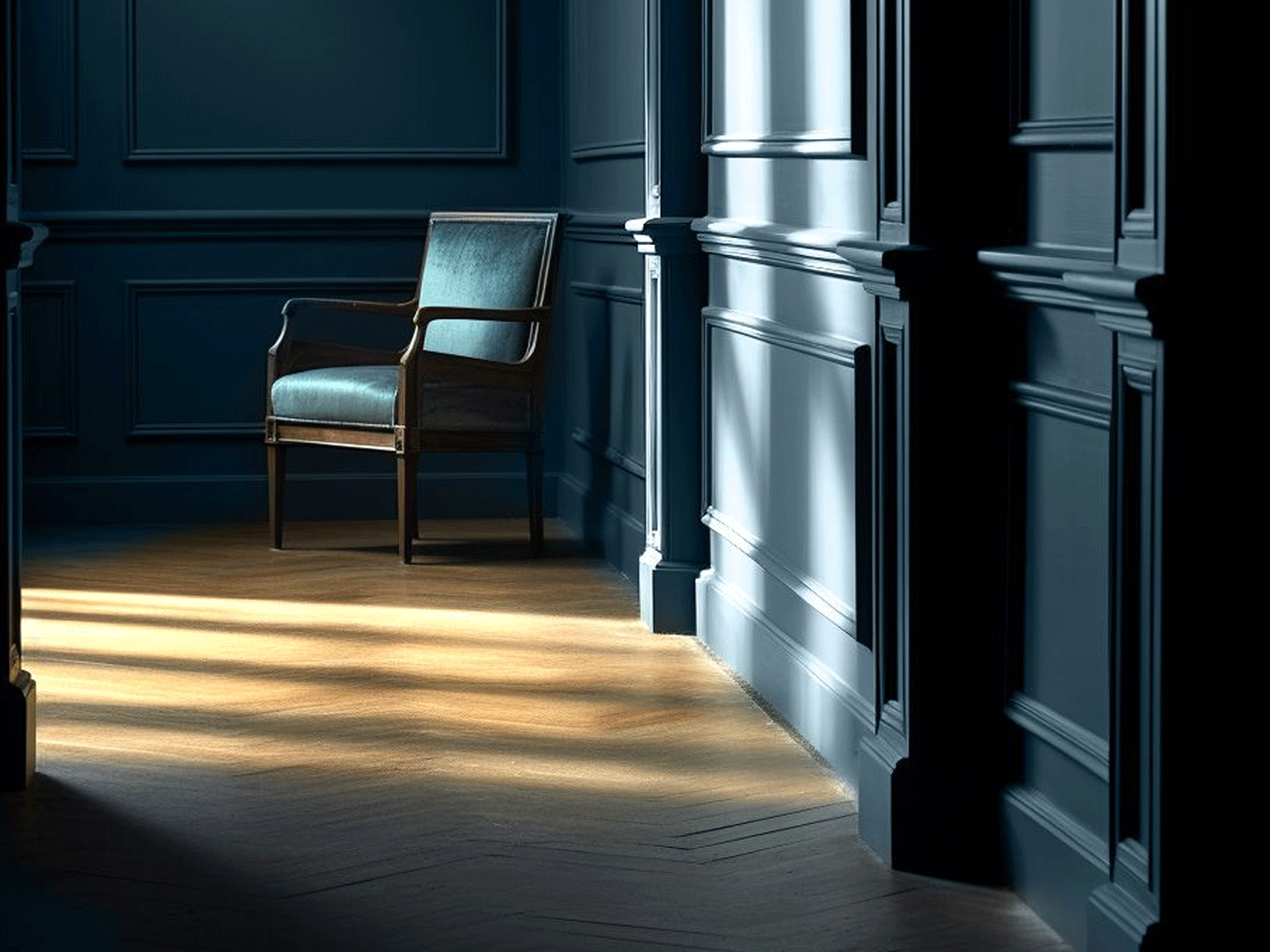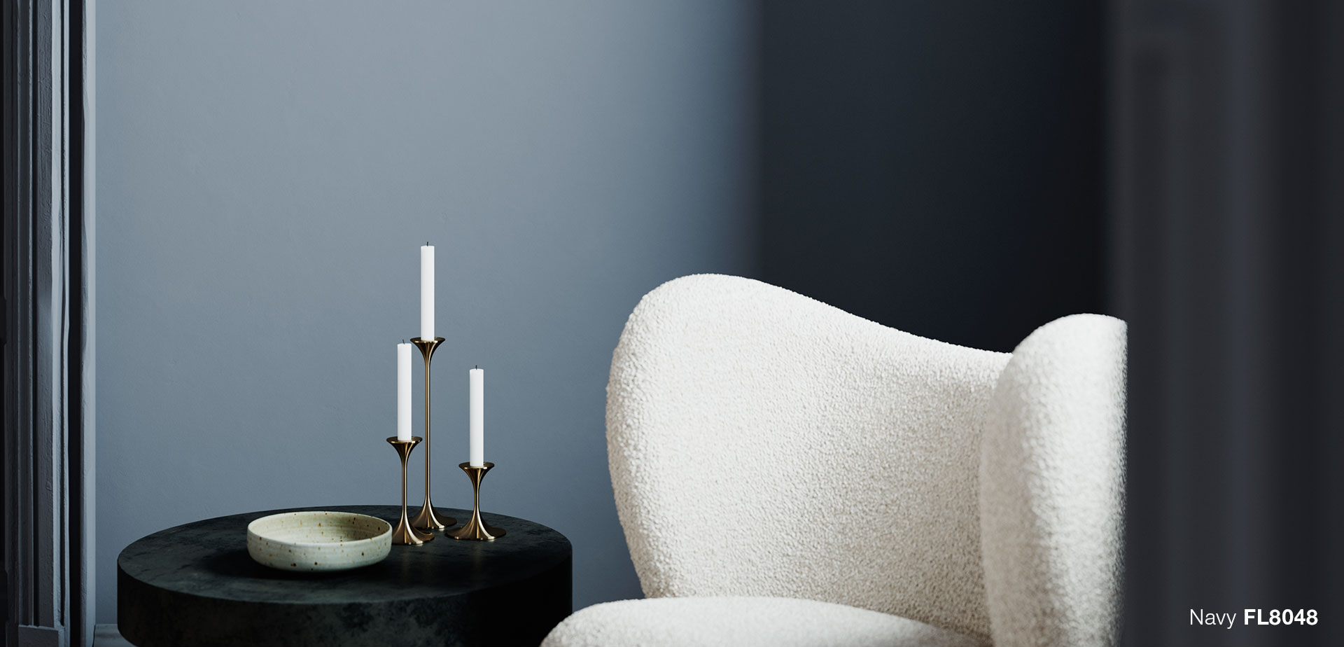 Med farven Navy FL8048 kommer de store rum til at virke mere hyggelige og intime – tingene trækker sig sammen om dig, og den skaber en sfære af fordybelse omkring dig. Den trækker dit fokus hen på de ting, som du har foran dig, og hen på de samtaler, som du har.