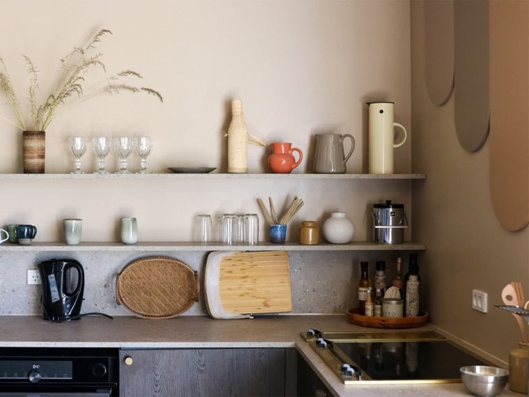 Køkkenet prydes af varme og rolige nuancer som Glass Hall, Cosy Cover, Råhvid og Lys Terracotta – en harmonisk palet af natur og elegance.
