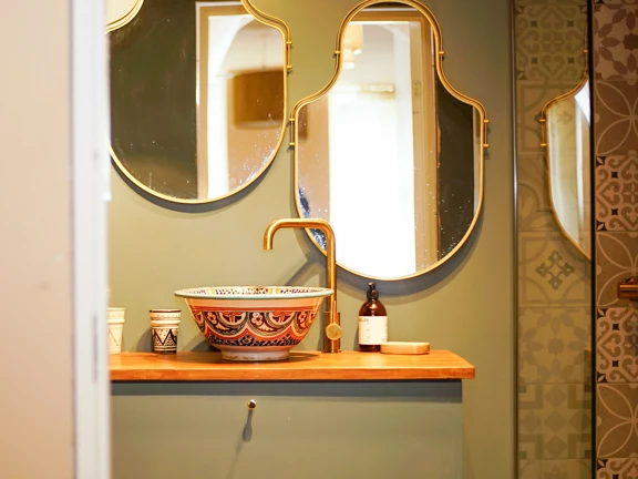 I badeværelset er der brugt S5010-B30G – en afdæmpet, elegant farve med grønne og gyldne toner, der skaber harmoni.
