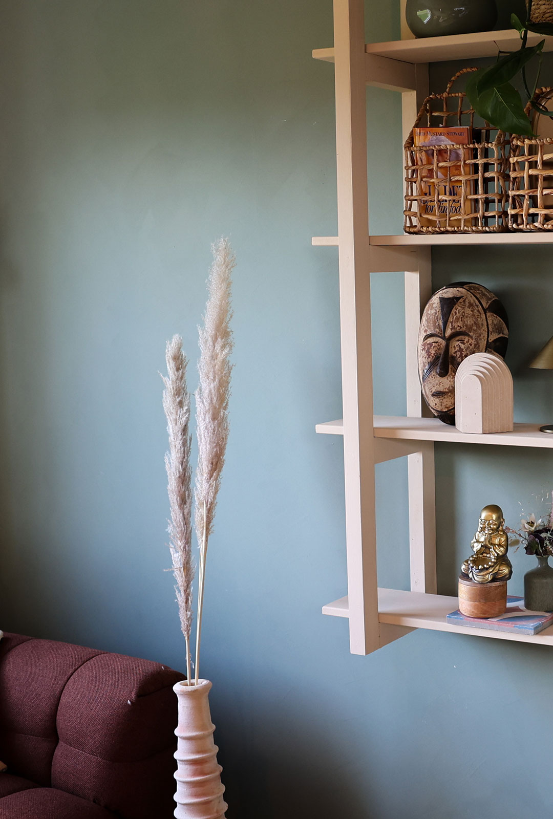 I det blå hus finder man en spisestue, der forener leg og farver med kreativitet og personlighed. Lyserøde og blå nuancer, kombineret med åbne hylder fyldt med glas, keramik og spil, skaber en stemning, der indbyder til både hverdagsliv og festligt samvær.