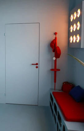 En alt-i-én-løsning var det, det røde hus gik efter, da de skulle indrette deres entré. Løsningen blev en smart, hjemmelavet bænk med indbygget skoreol og opbevaring til småting, og i den anden side af rummet en væg til væg skabsløsning.