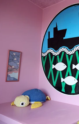 Der er smæk på den lyserøde farve i entréen hos Blåt hus, som er fint dekoreret med finurlige elementer.