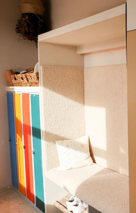 Genbrug af skabe fra et omklædningsrum, en blød siddeplads og smarte opbevaringsløsninger til fodtøj og småting, er den løsning, parret i Grønt hus har valgt til deres entré.