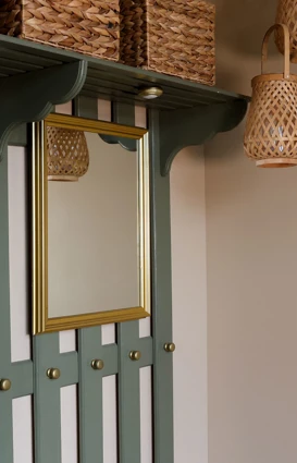 Gør genbrugsfund til praktiske elementer i indretningen som Gult hus. De har givet nyt liv til en garderobe, som indeholder både knagrække, hattehylde og spejl.