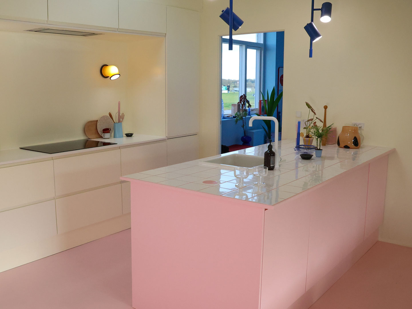 Dette køkken emmer af personlighed og kreativitet med sin legende farvepalet og moderne design. De lyse skabe skaber en rolig base, mens den pink køkkenø og gulv tilfører varme og et friskt pust af farve. Øens hvide flisebordplade giver et nostalgisk touch, samtidig med at det understreger rummets rene linjer.