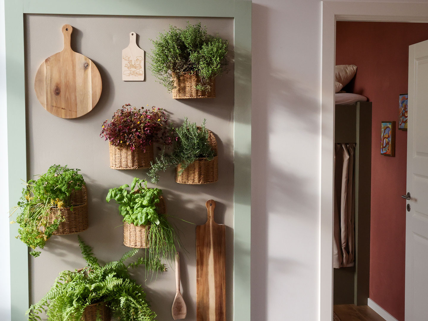 I det grønne hus er vægdekorationen ikke kun til pynt. Det er lavet som en smart kombination af opbevaring til skærebrætter og lækre krydderurter.
