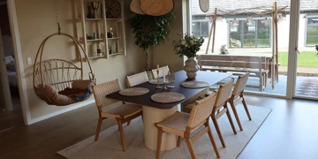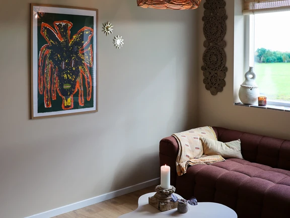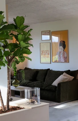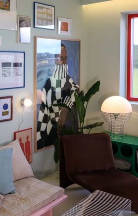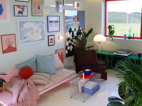 I det røde hus er der skruet helt op for kreativitet og personlighed. Væggene er dækket af farverige kunstværker, der giver rummet karakter og varme. Den lyserøde daybed med bløde puder inviterer til afslapning, mens den lave sofabordsløsning understreger det legende udtryk. Loungestolen, de grønne planter og rene linjer er med til at give balance til stuen. Det er et rum, hvor stil og stemning går hånd i hånd – perfekt til både hverdagshygge og samtaler i selskab med plader på grammofonen.