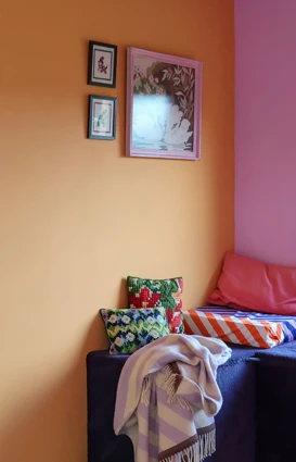 Der er endnu en gang knald på farverne i det blå hus, hvor stuen har lagt vægge til en energifyldt orange på den ene væg, og en omfavnende lyserød på de resterende vægge.
