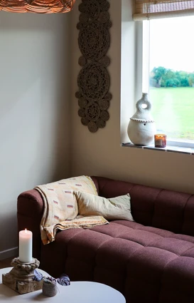Den orientalske stemning har også indfundet sig i stuen hos parret i det gule hus. Rummet emmer af personlighed, varme og hygge med sin afdæmpede farvepalette og kunstneriske detaljer. Den polstrede sofa i en dyb bordeauxfarve inviterer til afslapning, mens bløde puder og tæppet understreger komforten. De små dekorative detaljer som de flettede vægornamenter, den rustikke keramikvase i vinduet og stearinlys skaber en sanselig stemning, samtidig med at lyset fra vinduet strømmer ind og åbner rummet op.