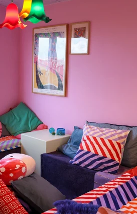 De lyserøde vægge og det farverige tilbehør byder op til sjov og ballade i stuen i det blå hus.