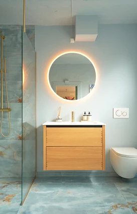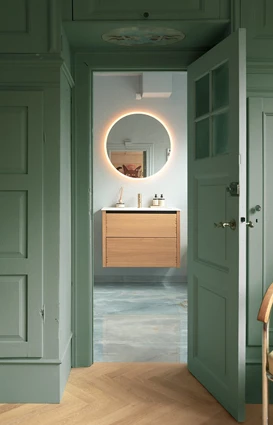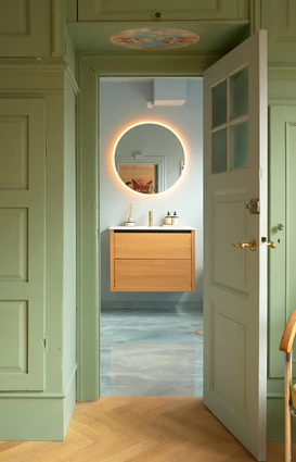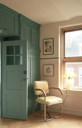 Badeværelset er malet i Lucca. Døren ud mod stuen i Avocado. Indefra igen Lucca. Et kompromis der hellere vil dø … end at være kedeligt.