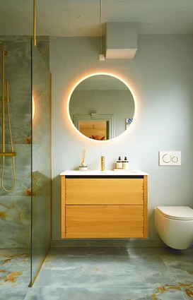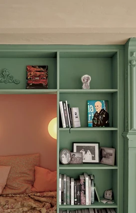 Køkkenet har fået sin egen scene. Skabene i Avocado, bordplader i grøn marmor, døren i Lemon. Inspirationen kom fra detaljerne i lejligheden … delfin-håndtag og stuk på dørene … og fra steder, hvor man tør bygge stemninger helt ud.