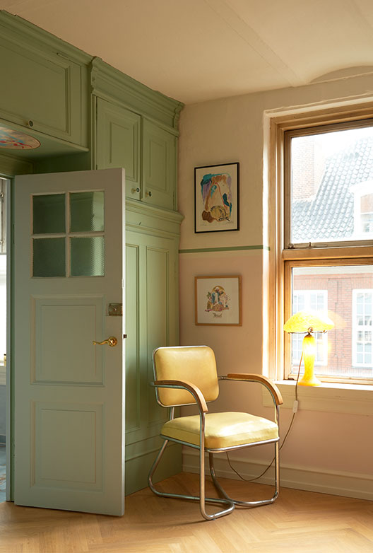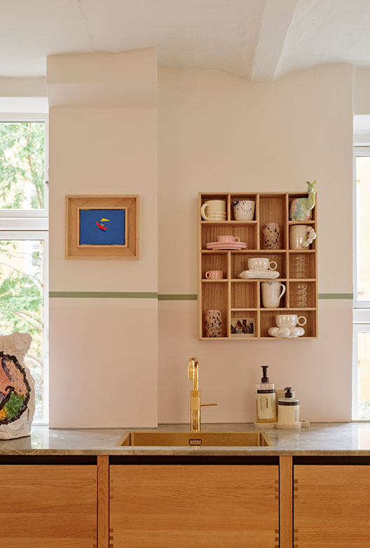 Køkkenet har fået sin egen scene. Skabene i Avocado, bordplader i grøn marmor, døren i Lemon. Inspirationen kom fra detaljerne i lejligheden … delfin-håndtag og stuk på dørene … og fra steder, hvor man tør bygge stemninger helt ud.
