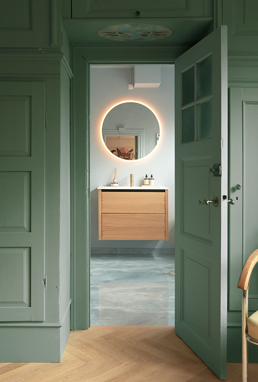 Badeværelset er malet i Lucca. Døren ud mod stuen i Avocado. Indefra igen Lucca. Et kompromis der hellere vil dø … end at være kedeligt.