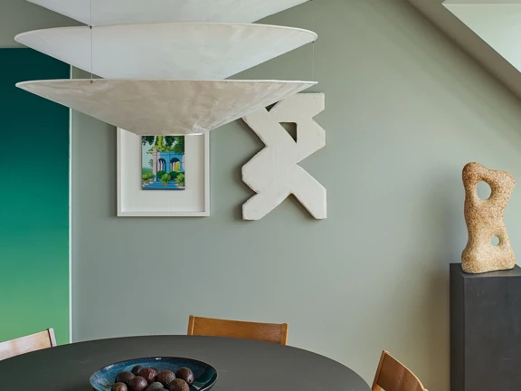 Han har ellers længe gået uden om trenden med farver i hjemmet, fordi han betragtede det som en lidt for letkøbt måde at gøre sit hjem interessant, men i dag ser han anderledes på det: ”Altså det kan jo noget, det må jeg bare erkende. De farver vi drages af i naturen er jo heller aldrig beige og brune, så hvorfor sku’ man male sit hjem i de farver?”, siger Emil Thorup, der nu for anden gang har indrettet et hjem med farver. Denne gang har det dog været vigtigt for ham at finde tilbage til den stringens, der kendetegner hans stil: ”Sidst gik vi lidt for meget amok med farverne, så denne gang har vi fx valgt én farve til alt træværk for at skabe bedre sammenhæng”, fortæller Emil, der ud over farven Dark Teal til træværket har valgt fem grønne nuancer til sine vægge: Sage, Fine Fig, Viggo og Iceland. De fem nuancer af grøn ligger inden for samme skala, hvilket skaber ro og sammenhæng gennem hele boligen