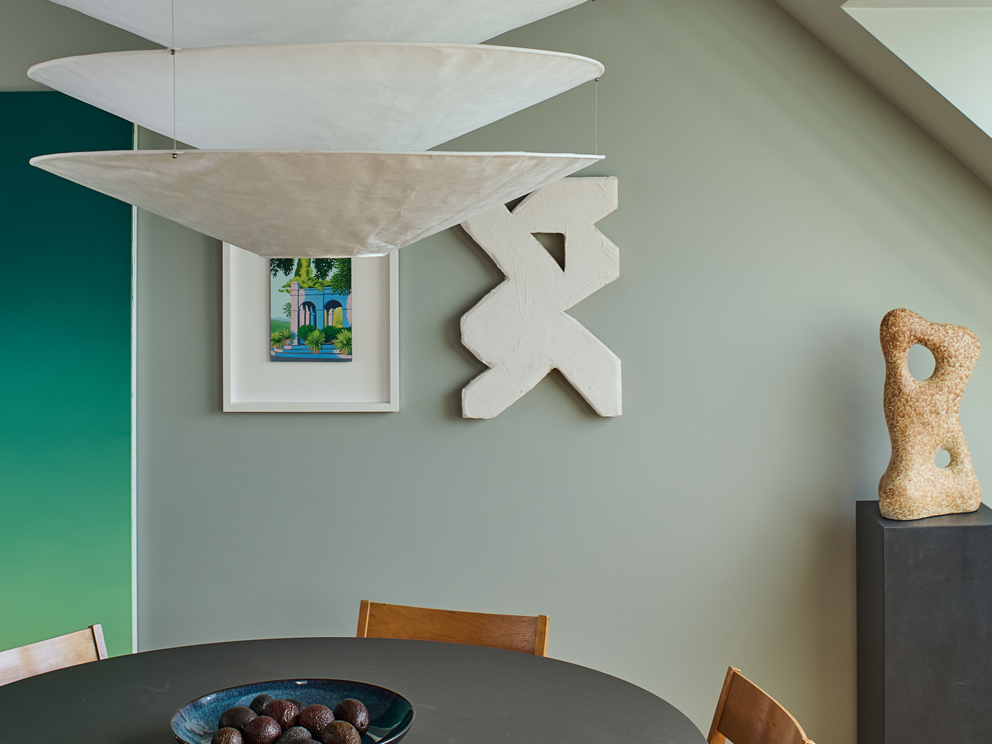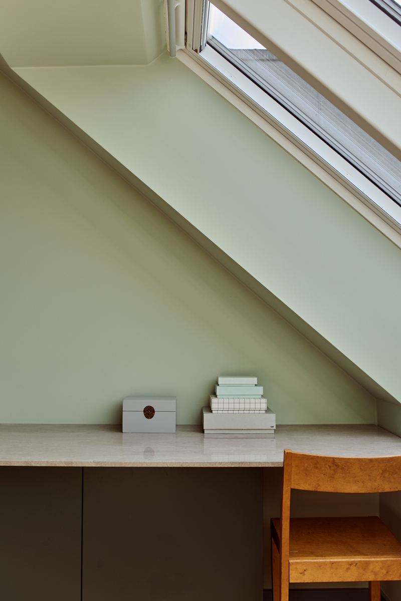 Han har ellers længe gået uden om trenden med farver i hjemmet, fordi han betragtede det som en lidt for letkøbt måde at gøre sit hjem interessant, men i dag ser han anderledes på det: ”Altså det kan jo noget, det må jeg bare erkende. De farver vi drages af i naturen er jo heller aldrig beige og brune, så hvorfor sku’ man male sit hjem i de farver?”, siger Emil Thorup, der nu for anden gang har indrettet et hjem med farver. Denne gang har det dog været vigtigt for ham at finde tilbage til den stringens, der kendetegner hans stil: ”Sidst gik vi lidt for meget amok med farverne, så denne gang har vi fx valgt én farve til alt træværk for at skabe bedre sammenhæng”, fortæller Emil, der ud over farven Dark Teal til træværket har valgt fem grønne nuancer til sine vægge: Sage, Fine Fig, Viggo og Iceland. De fem nuancer af grøn ligger inden for samme skala, hvilket skaber ro og sammenhæng gennem hele boligen