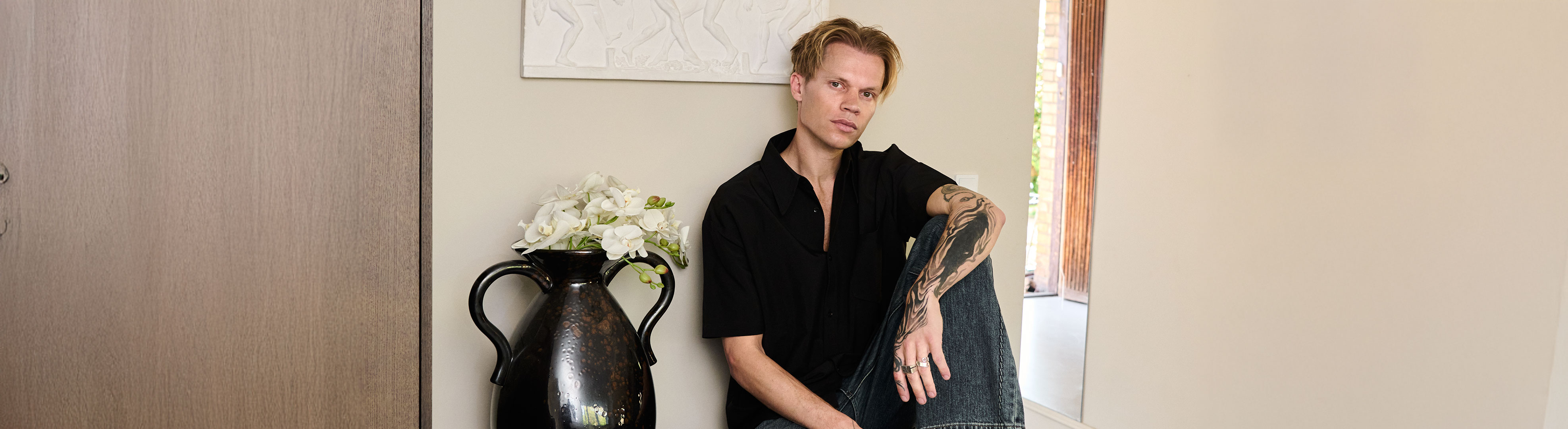 Mød Søren Le Schmidt. En københavnsk designer, der har gjort sit navn på skræddersyede kollektioner med grafiske linjer og en moderne kant. Han har klædt profiler på røde løbere både herhjemme og i udlandet og indgået samarbejder med Holmegaard, Sofacompany og Pilgrim. I dag bor han i Gentofte sammen med sin hustru Nikoline og deres tvillinger Marlon og Mio i et hus, som familien overtog i 2024 og satte fuldstændig i stand.