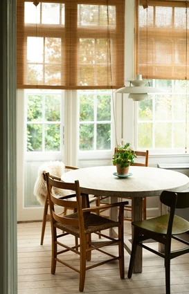 ”Jeg elsker udestuen. Den var bare en vinterstue, men nu har vi isoleret den og malet den, og vi bruger den som spisestue. Det er også her, jeg sidder og arbejder.”