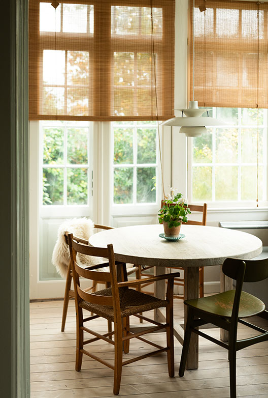 I stuen ligger de varme toner, hvor solen bevæger sig gennem dagen. Men den virkelige magi sker i udestuen. Den er malet, brugt, elsket. Det er jo her lyset står længst, og det er blevet Pippi Olivias yndlingssted.