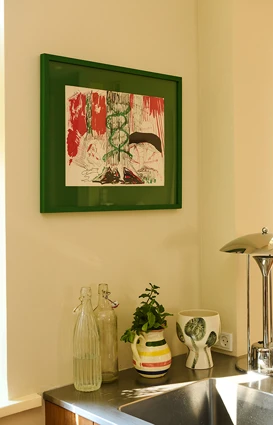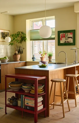 Josefine er særligt inspireret af 70’ernes uhøjtidelige og eksperimenterende indretningsstil og blander f.eks. gerne varme træsorter med kolde metaller og stramt dansk design med tekstiler i organiske mønstre. Ligeledes inspireret af 70’erne er Josefine optaget af at bringe naturen indenfor. Grøn er derfor en genganger i hendes indretning i form af både planter, vægfarver og interiør. I køkkenet er det den lyse, gyldengrønne Pocket Green, der blender smukt sammen med White Sand og komplementerer det varme egetræ og det australske kærlighedstræ, der har sin plads på køkkenbordet. Træet har stor betydning for Josefine – hun fik det, da hun flyttede til København som 18-årig og har siden elsket at betragte dets former og følge med i hvordan det langsomt men sikkert vokser sig større. Kombinationen af forskellige indretningselementer og de naturinspirerede farver og materialer skaber en hjemlig og afslappende atmosfære.