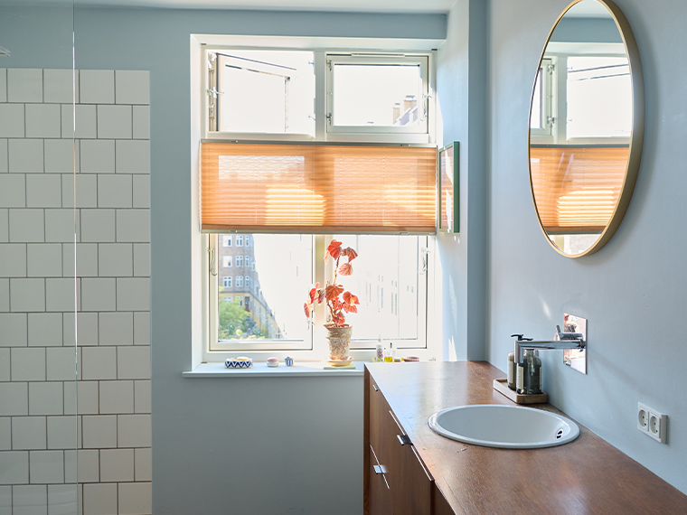 Også på badeværelset har Josefine hentet inspiration fra naturen. Her er det den lyse, himmelblå, Bornholm, der skaber en på én gang frisk og beroligende atmosfære.