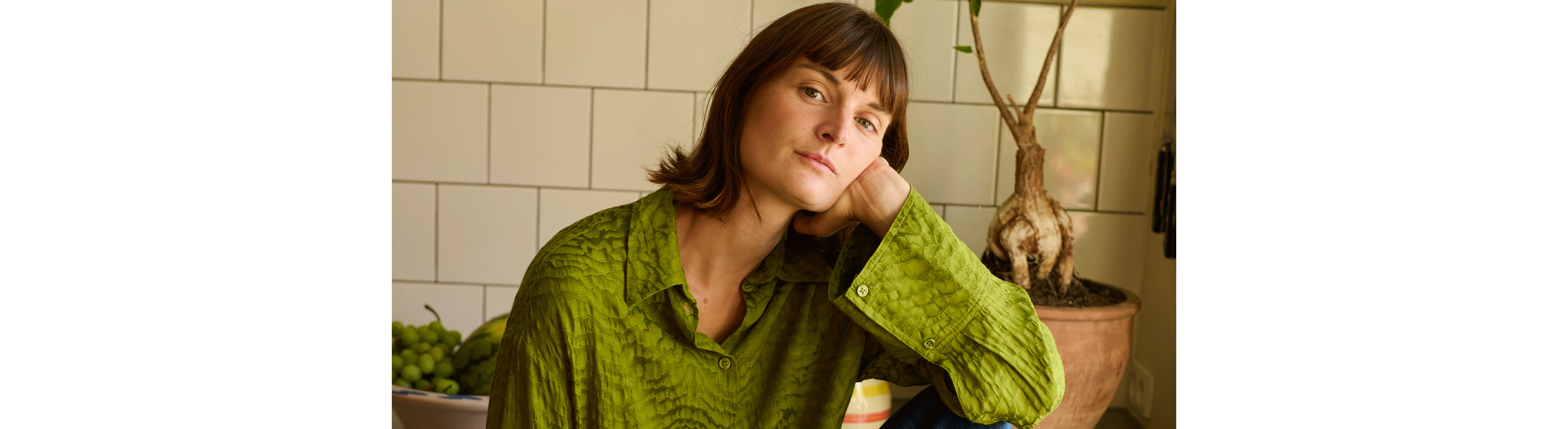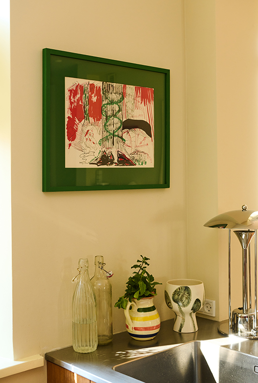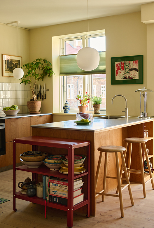 Josefine er særligt inspireret af 70’ernes uhøjtidelige og eksperimenterende indretningsstil og blander f.eks. gerne varme træsorter med kolde metaller og stramt dansk design med tekstiler i organiske mønstre. Ligeledes inspireret af 70’erne er Josefine optaget af at bringe naturen indenfor. Grøn er derfor en genganger i hendes indretning i form af både planter, vægfarver og interiør. I køkkenet er det den lyse, gyldengrønne Pocket Green, der blender smukt sammen med White Sand og komplementerer det varme egetræ og det australske kærlighedstræ, der har sin plads på køkkenbordet. Træet har stor betydning for Josefine – hun fik det, da hun flyttede til København som 18-årig og har siden elsket at betragte dets former og følge med i hvordan det langsomt men sikkert vokser sig større. Kombinationen af forskellige indretningselementer og de naturinspirerede farver og materialer skaber en hjemlig og afslappende atmosfære.