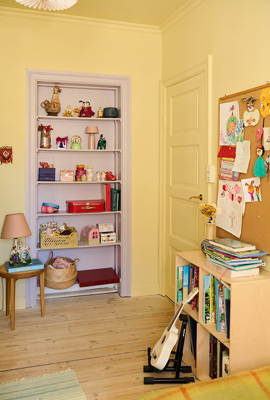 Farver er en stor del af Josefines hverdag og hun drømmer altid om nye farvekombinationer. Hun får også ofte lyst til at male hele hjemmet om, men ender alligevel med at holde de store flader i afdæmpede farver, da hun ved at hun hurtigt vil blive træt af det, hvis hun vælger for dominerende farver. I stedet får farveglæden frit spil i hendes interiør. I soveværelset får den lyse gammelrosa nuance, Brown Rose, modspil af de farverige elementer, mens det på børneværelset er den bløde gule Lemon, der smukt komplementeres af den indbyggede reol, der er malet i Fine Flora.