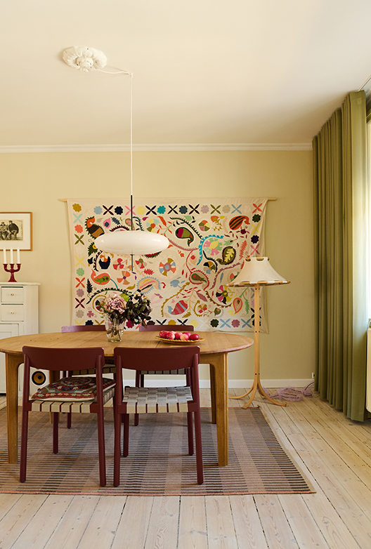 Når man lægger flere rum sammen for at skabe store, åbne rum i en bolig, kræver det lidt mere at opnå en intim og hjemlig stemning. Den udfordring har Josefine løst med tekstiler, der giver rummene taktilitet og en visuel ro. Med gulv til loft gardiner blødes væggene op, mens gulvtæpper markerer de forskellige zoner – køkkenet, spisepladsen og sofaområdet. Og så er der det store vintage vægtæppe ved spisebordet, der er et smukt, farverigt indslag i indretningen. Foruden den visuelle ro bidrager de mange tekstiler desuden positivt til akustikken.