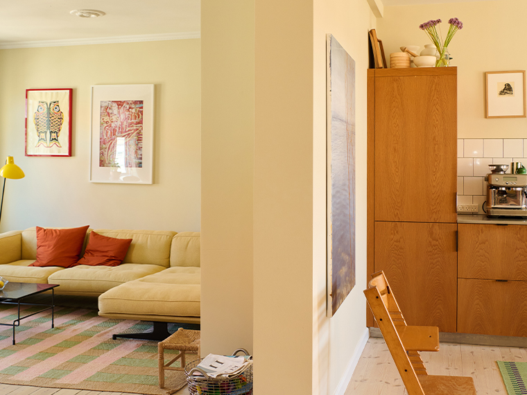 Da Josefine og hendes kæreste, Andreas, overtog andelslejligheden på Nørrebro, var noget af det første de gjorde at etablere åben forbindelse mellem køkkenet og lejlighedens to stuer. På den måde fik de skabt en rumlighed, der afspejler deres åbne tilgang til samvær med både hinanden og deres gæster. I dag er det familiens samlingssted og her er ofte gang både i kreaprojekter og sofahopperi, mens madlavningen står på og samtalen flyder hen over køkkenøen. For at understrege sammenhængen mellem de tre rum, er de alle malet i samme farve – den varme, lyse White Sand, der samtidig giver et naturligt og roligt udtryk.