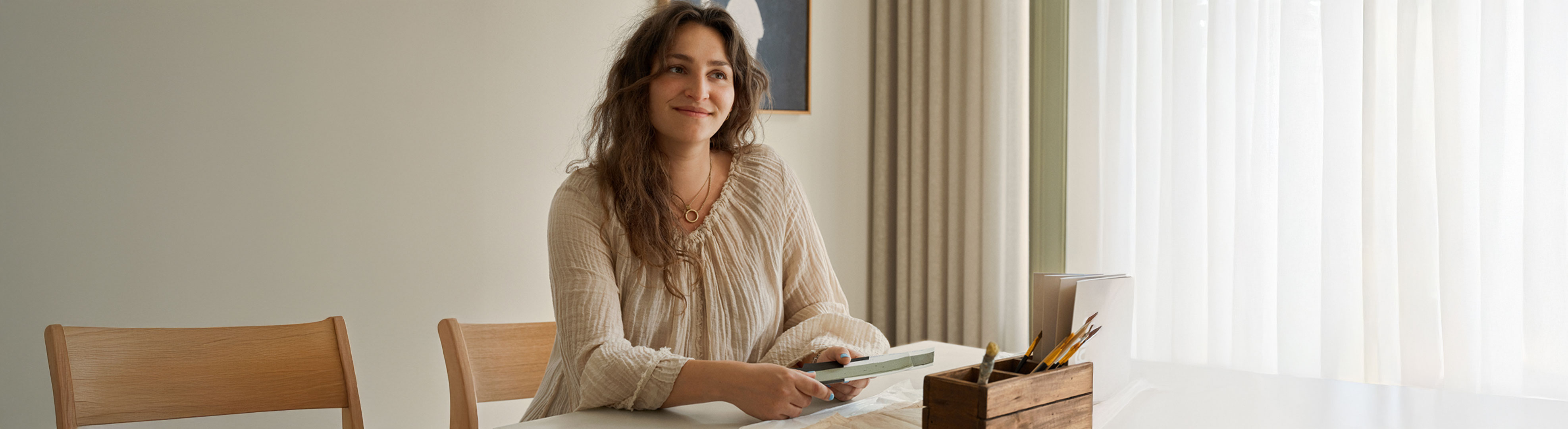“Mange tror, at hvis alt bare er hvidt, så bliver det roligt. Men det gør det modsatte. Når fladerne får farve, giver det varme og identitet, uden at det behøver at blive voldsomt. Det handler om at vælge en base og så lade farverne spille sammen, så helheden holder.”