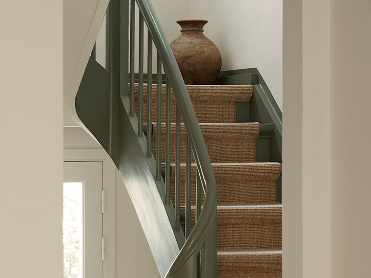 Det gamle træværk fik farven Moss Flügger 80, en kølig grøn der viderefører tonen i døre og paneler. På den måde samles rummene, så bevægelsen fra etage til etage bliver en del af fortællingen.