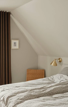 Kontoret er malet i Truffle, en mørk brun jordtone med varme undertoner, som giver koncentration og fordybelse. Hallen er Flat White, en brudt og blød hvid med varme nuancer, der binder rummene sammen uden at det nogensinde bliver klinisk. Soveværelset er igen Cotton, så den samme varme og inspirerende stemning følger ad.