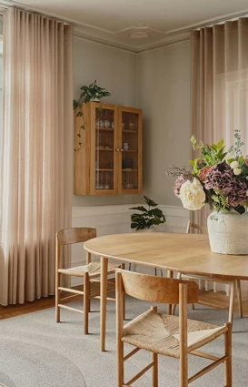 “Nordisk og elegant. Rød tråd gennem hele huset, men samtidig leg med kontraster, nyt og gammelt, dansk design og genbrug og farver, som passer til husets stil.”