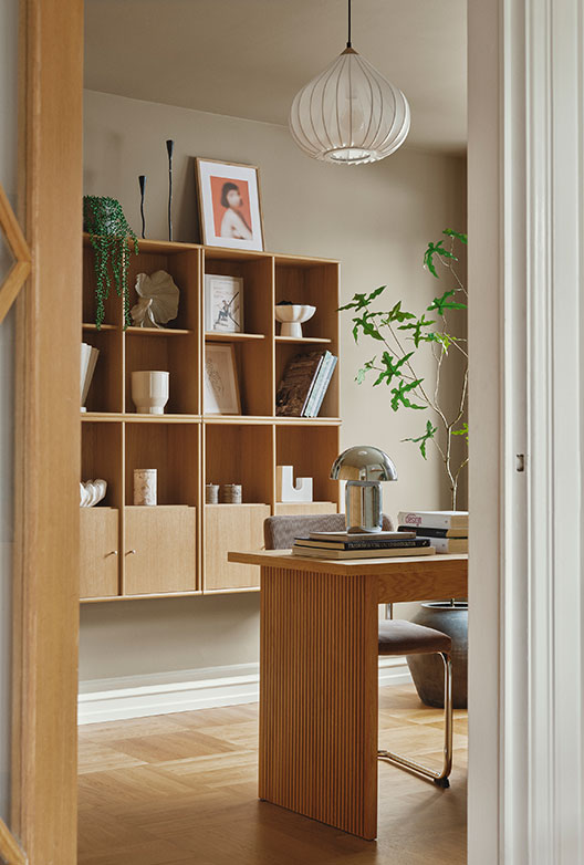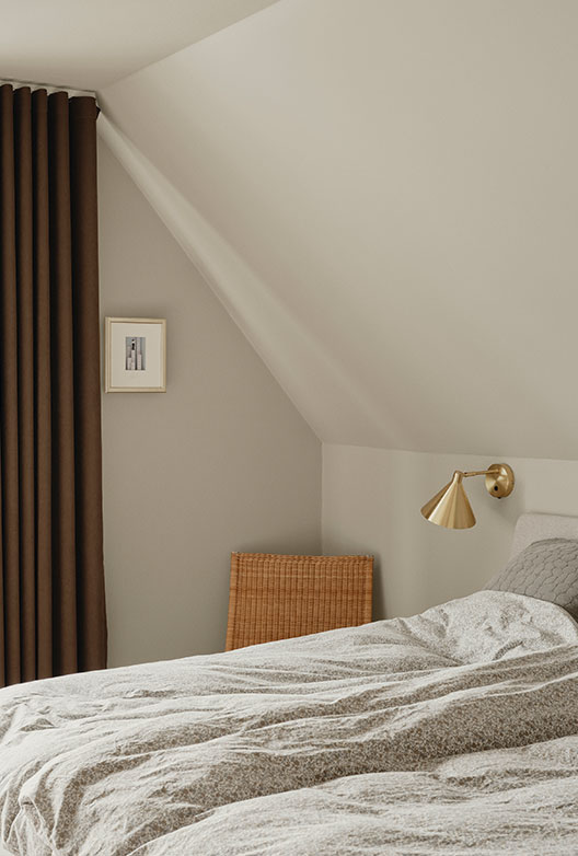 Kontoret er malet i Truffle, en mørk brun jordtone med varme undertoner, som giver koncentration og fordybelse. Hallen er Flat White, en brudt og blød hvid med varme nuancer, der binder rummene sammen uden at det nogensinde bliver klinisk. Soveværelset er igen Cotton, så den samme varme og inspirerende stemning følger ad.