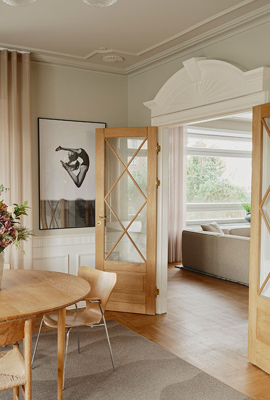 Vi træder ind i en murermestervilla fra 1936 og mærker fandeme historien med det samme med de høje lofter, de klassiske paneler der står snorlige og de solide gulve, hvor proportionerne allerede var tænkt ordentligt igennem fra første streg.