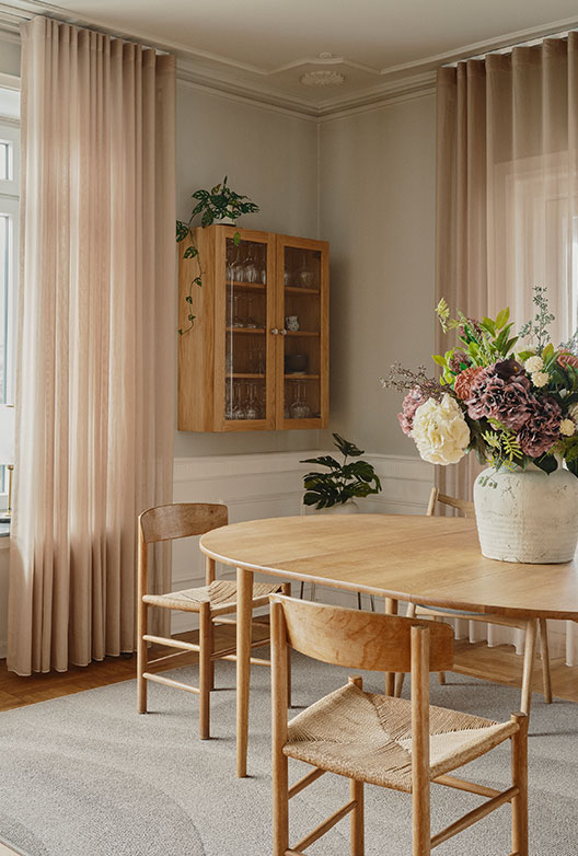 “Nordisk og elegant. Rød tråd gennem hele huset, men samtidig leg med kontraster, nyt og gammelt, dansk design og genbrug og farver, som passer til husets stil.”