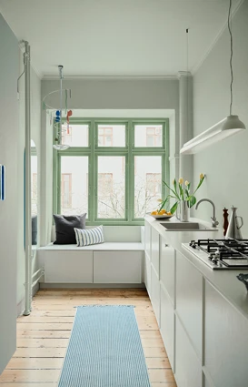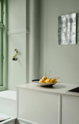 Fra sin yndlingsplads i køkkenet kan Nicolai betragte det smukke, lysegrønne løvtræ, der netop er begyndt at springe ud. Denne sprøde, grønne farve kan man kun blive glad af at se på, og derfor har Nicolai og Christian taget den med indenfor, hvor de har ladet ”Avocado” pryde træværket som en smuk indramning af udsigten.