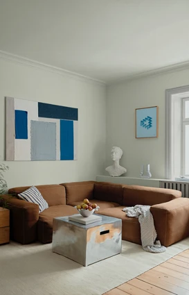 Til væggene i stuen har de valgt den lyse ”Oslo”, der med sit gyldne strejf spiller smukt op ad den blødere lysegrønne ”Viggo” i loftet. De afdæmpede grønne nuancer danner en smuk baggrund for hjemmets interiør, hvor gylden brun, dyb blå og krom er gennemgående.