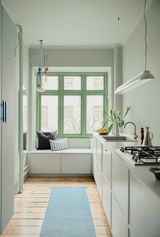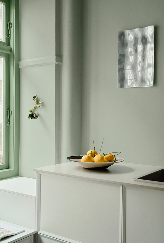 Fra sin yndlingsplads i køkkenet kan Nicolai betragte det smukke, lysegrønne løvtræ, der netop er begyndt at springe ud. Denne sprøde, grønne farve kan man kun blive glad af at se på, og derfor har Nicolai og Christian taget den med indenfor, hvor de har ladet ”Avocado” pryde træværket som en smuk indramning af udsigten.