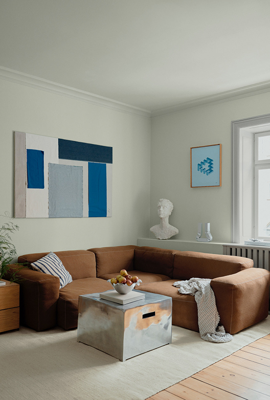 Til væggene i stuen har de valgt den lyse ”Oslo”, der med sit gyldne strejf spiller smukt op ad den blødere lysegrønne ”Viggo” i loftet. De afdæmpede grønne nuancer danner en smuk baggrund for hjemmets interiør, hvor gylden brun, dyb blå og krom er gennemgående.