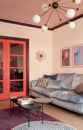 I stuen har hun malet væggene i en støvet lyserød nuance ved navn “Pink Picnic” og loftet i en lidt mørkere rosa tone (“Flamingo”) for at skabe kontrast. Dyb vinrød på paneler og karme skaber modspil til de lyse rosatoner, mens en mintgrøn dør tilfører et legende udtryk.