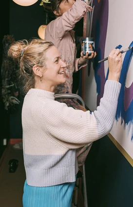 Allerede i entréen rammer en dyb blå én, og når man drejer til højre, udfolder et vægmaleri sig . Skabt i samarbejde med kunstneren Amandah L'Narte. Som en overgang til en ny stemning.