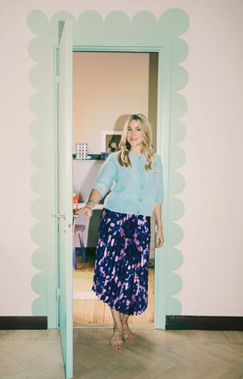 “Det er ret dystert i samfundet lige nu … og pink er den mest humørløftende farve.” Hun bemærker, at man bliver glad og energisk af den … som at åbne en flaske champagne: boblende, boblende glæde.