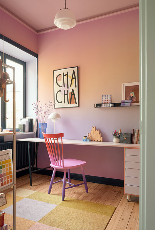 Det er sjældent bevidst frygt, snarere en usikkerhed. En tvivl om, hvordan man arbejder med nuancer og lys. Netop derfor guider Sara sine kunder nænsomt ud af komfortzonen. Hun forklarer, hvordan bestemte kulører kan påvirke vores sind: blå skaber ro og fokus, grøn giver balance og velvære, gul fremmer glæde og læring, mens rød vækker energi.