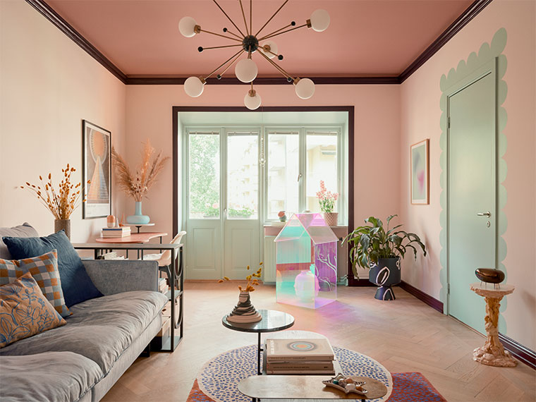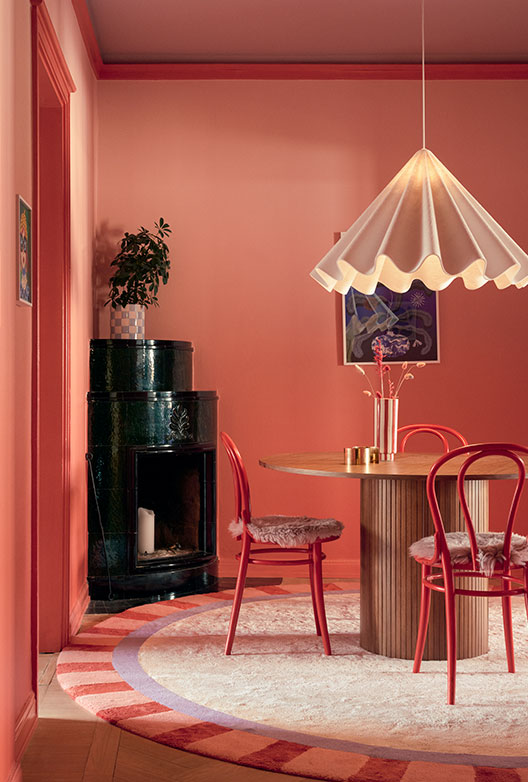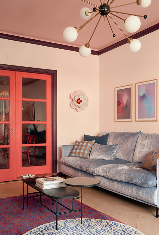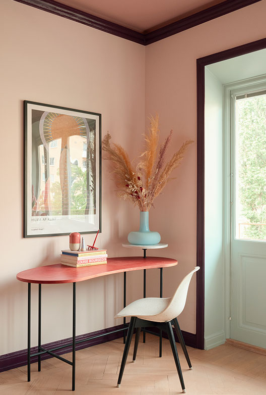 I stuen har hun malet væggene i en støvet lyserød nuance ved navn “Pink Picnic” og loftet i en lidt mørkere rosa tone (“Flamingo”) for at skabe kontrast. Dyb vinrød på paneler og karme skaber modspil til de lyse rosatoner, mens en mintgrøn dør tilfører et legende udtryk.