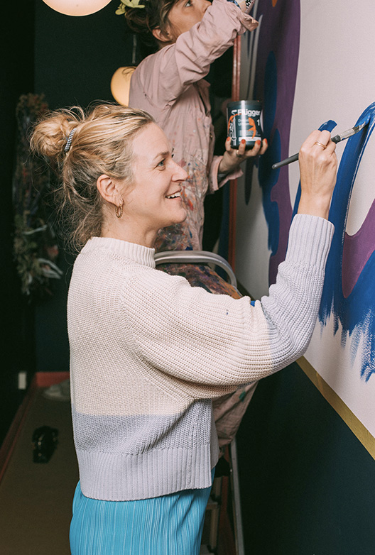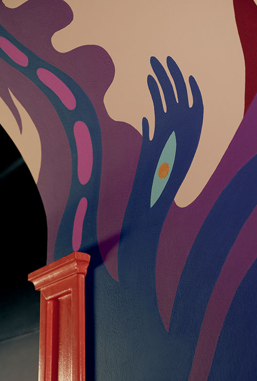 Allerede i entréen rammer en dyb blå én, og når man drejer til højre, udfolder et vægmaleri sig . Skabt i samarbejde med kunstneren Amandah L'Narte. Som en overgang til en ny stemning.
