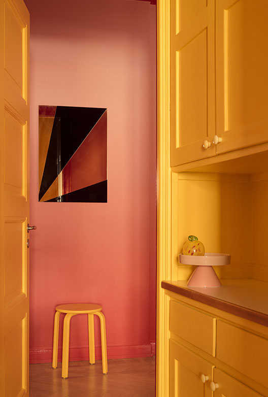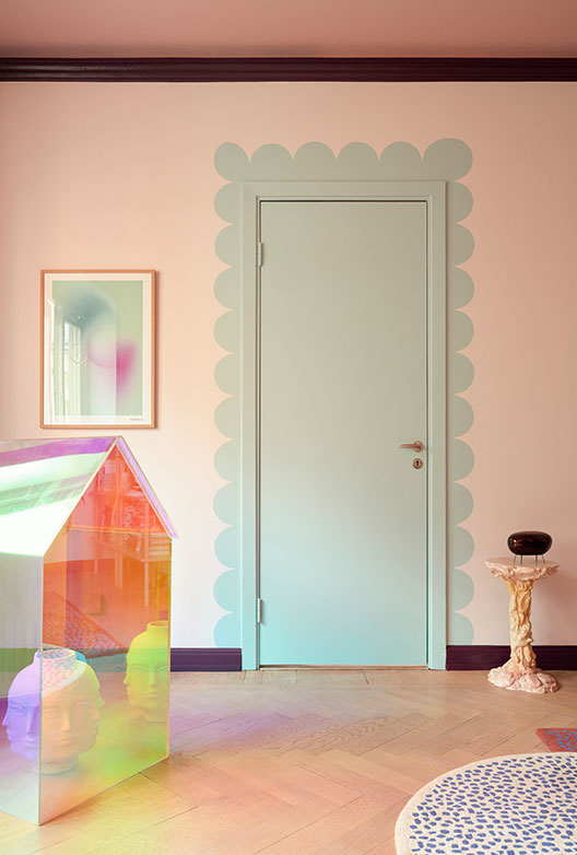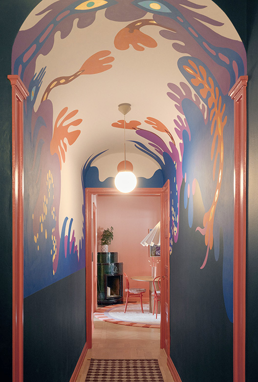 Det føles ikke som at træde ind i en lejlighed. Det føles som at træde ind i et sind. Et sted, hvor farverne ikke bare bliver på væggene, men overskrider dem. Som om de trænger ud. Skifter form. Tilstand. Dimension. De sidder ikke fast i malingen. De bevæger sig. Ind i én. Gør noget ved én.