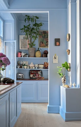 Køkkenet er et helt andet beast. En anden temperatur. Som en afbrydelse i rummets grammatik. Alt omsluttet af Berlinerblå. En farve med FYSISK tilstedeværelse, nærmest elektrisk.