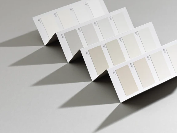 Otte farvefamilier med bløde, rolige neutrale nuancer fra kridhvid over kølig grå til gylden beige. Hver familie rummer fire toner fra lys til mørk, så du kan vælge præcis hvor diskret eller markant dit farvevalg skal være.