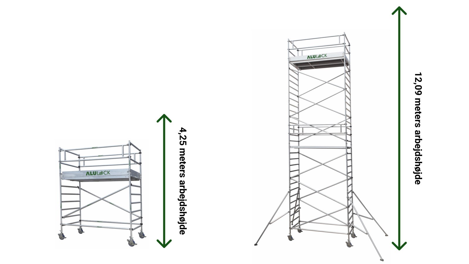 Alle rullestilladser fra Alulock er godkendte til en belastning på 200 kg. / M2 og kan alle bygges til en platformshøjde på 10,09 meter og en arbejdshøjde på 12,09 meter.